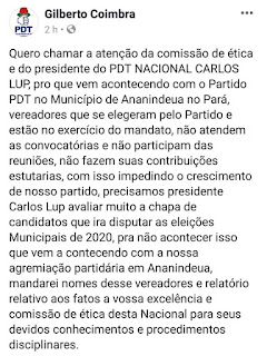 Chega a informação que agora pela noite em reunião da executiva municipal do PDT de Ananindeua, aconteceu a maior pancadaria entre membros do diretório e vereadores do município. A confusão é devido um post no Facebook do vice-presidente do partido, Gilberto Coimbra, que chamou os vereadores de caloteiros devido eles não cumprirem com suas obrigações estatutárias e que a sede do partido está ameaçada de despejo, pela falta de pagamento do aluguel, atrasado já há 03 meses.