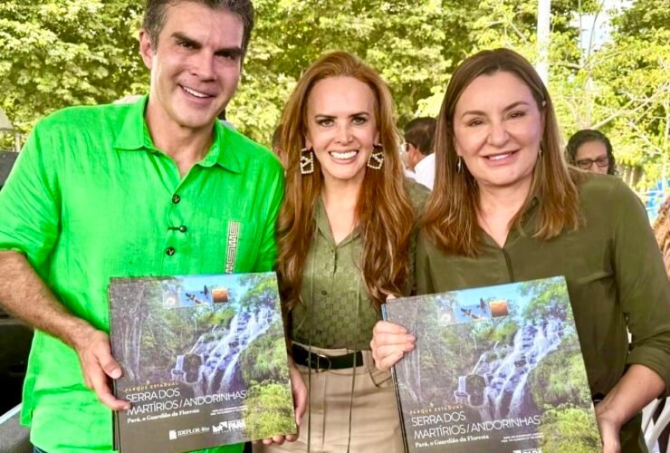 Lena Pinto entrega livros dos parques ambientais ao governador Helder Barbalho e à vice-governadora Hana.
