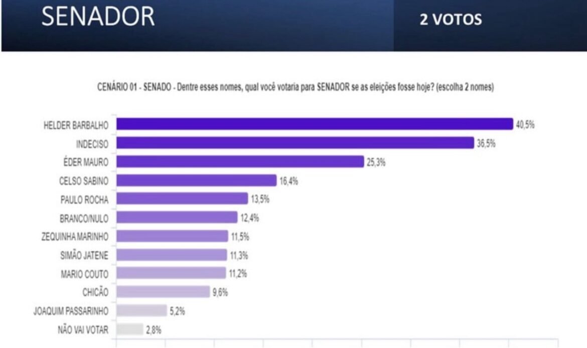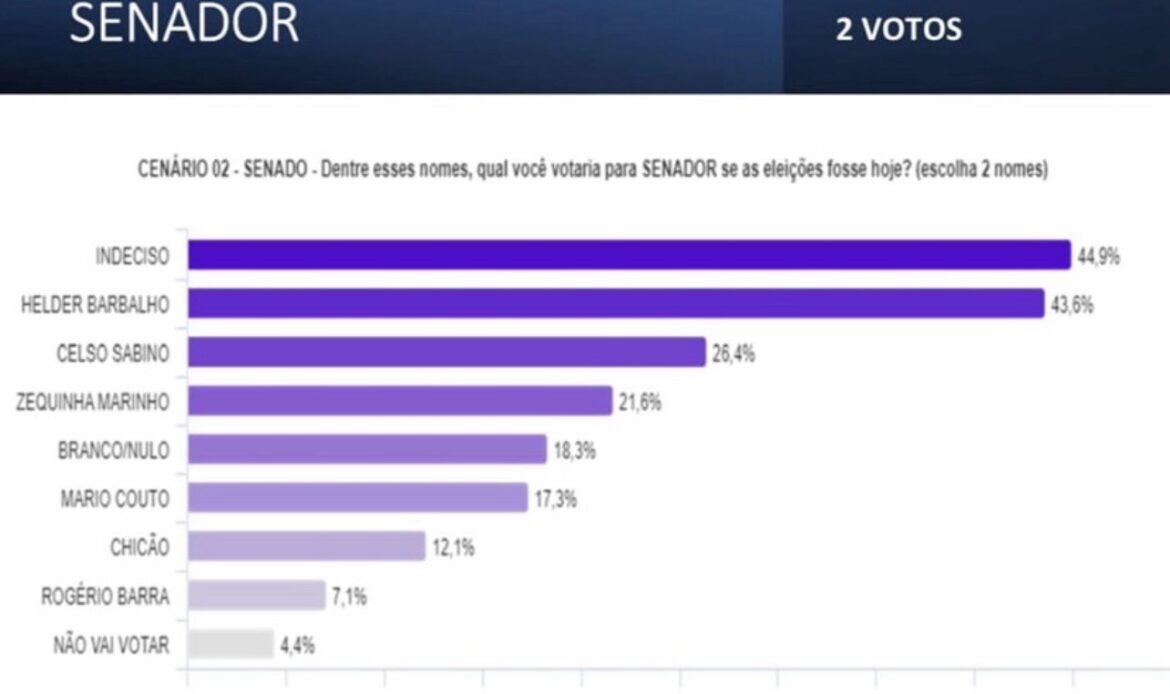 No segundo cenário, sem a presença de Eder, Helder sobe para 43,6% e Celso Sabino alcança 26,4%, ficando assim bem posicionado para disputa de uma das duas vagas ao senado no pleito de 2026.