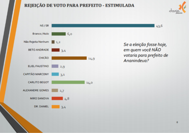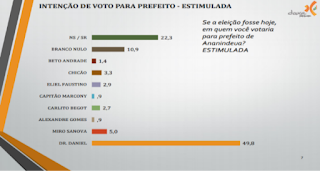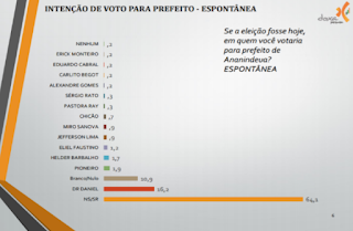 Se as eleições municipais em Ananindeua fossem hoje, o deputado estadual e Presidente da ALEPA Dr. Daniel Santos (MDB), ganharia com mais de 49,8% das intenções de voto. É o que revela a primeira pesquisa Eleitoral da DOXA para a Prefeitura de Ananindeua. A pesquisa foi realizada entre os dias 14 a 18 de Setembro com uma amostra de 600 entrevistados, tendo uma margem de erro de 3,5%. Mas sabemos que a Doxa sempre foi contra o Dr.Daniel e ao seu aliado Governador Helder Barbalho do MDB, então se eles estão dando esse resultado, a margem deve ser bem maior.