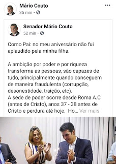 A baixaria na política no Pará é algo que todo dia já não surpreende. O ex-senador Mário Couto detona a filha e deputada Cilene Couto nas suas redes sociais. No título o pai diz: “Como Pai: no meu aniversário não fui aplaudido pela minha filha” e no texto ele acrescenta que a ambição por poder e por riqueza transforma as pessoas, são capazes de tudo, principalmente quando conseguem de maneira fraudulenta (corrupção, desonestidade, traição, etc).