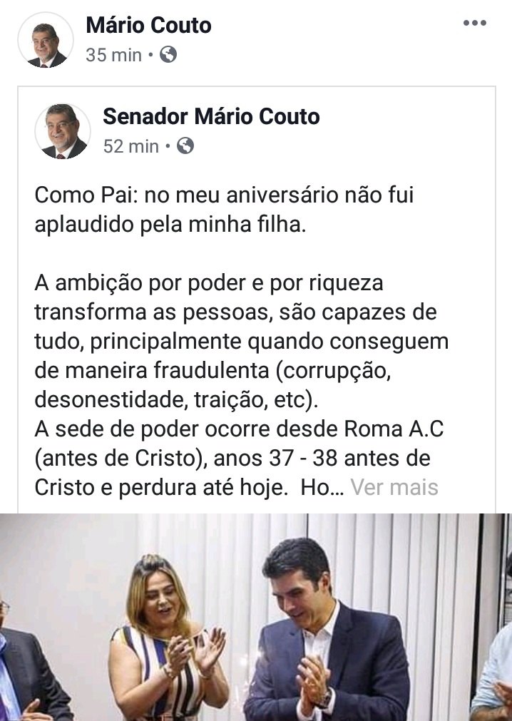 A baixaria na política no Pará é algo que todo dia já não surpreende. O ex-senador Mário Couto detona a filha e deputada Cilene Couto nas suas redes sociais. No título o pai diz: “Como Pai: no meu aniversário não fui aplaudido pela minha filha” e no texto ele acrescenta que a ambição por poder e por riqueza transforma as pessoas, são capazes de tudo, principalmente quando conseguem de maneira fraudulenta (corrupção, desonestidade, traição, etc).
