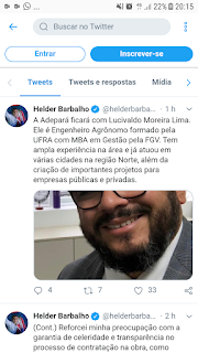 O governador eleito Helder Barbalho, também anunciou em seu Twitter, Lucivaldo Moreira Lima, que assumirá a Direção Geral da Agência de Defesa Agropecuária do Pará (Adepará). Ele é Engenheiro Agrônomo formado pela UFRA com MBA em Gestão pela FGV. Tem ampla experiência na área e já atuou em várias cidades na região Norte, além da criação de importantes projetos para empresas públicas e privadas.