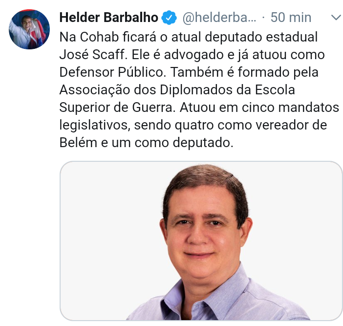 O governador eleito Helder Barbalho, anunciou também agora há pouco em seu Twitter, o ex-deputado estadual José Scaff que assumirá a Presidência da Companhia de Habitação do Estado do Pará (Cohab). Ele é advogado e já atuou como Defensor Público. Também é formado pela Associação dos Diplomados da Escola Superior de Guerra. Atuou em cinco mandatos legislativos, sendo quatro como vereador de Belém e um como deputado.