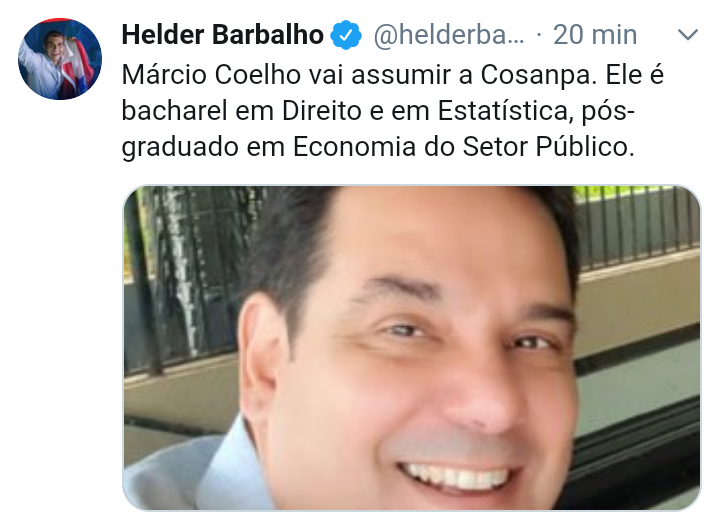 O governador eleito Helder Barbalho, anunciou agora há pouco em seu Twitter, Márcio Coelho que irá assumir a Companhia de Saneamento do Pará (Cosanpa). Ele é bacharel em Direito e em Estatística, pós-graduado em Economia do Setor Público. Atuou na Secretaria do Tesouro Nacional do Ministério da Fazenda, ocupando diversos cargos técnicos, como coordenador geral de Programação Financeira e coordenador geral de Gerenciamento de Fundos e Operações Fiscais. Trabalhou ainda no Ministério da Ciência e Tecnologia, como diretor de Políticas em Tecnologia da Informação e Comunicação. E no Ministério dos Esportes foi coordenador geral de Orçamento e Finanças.