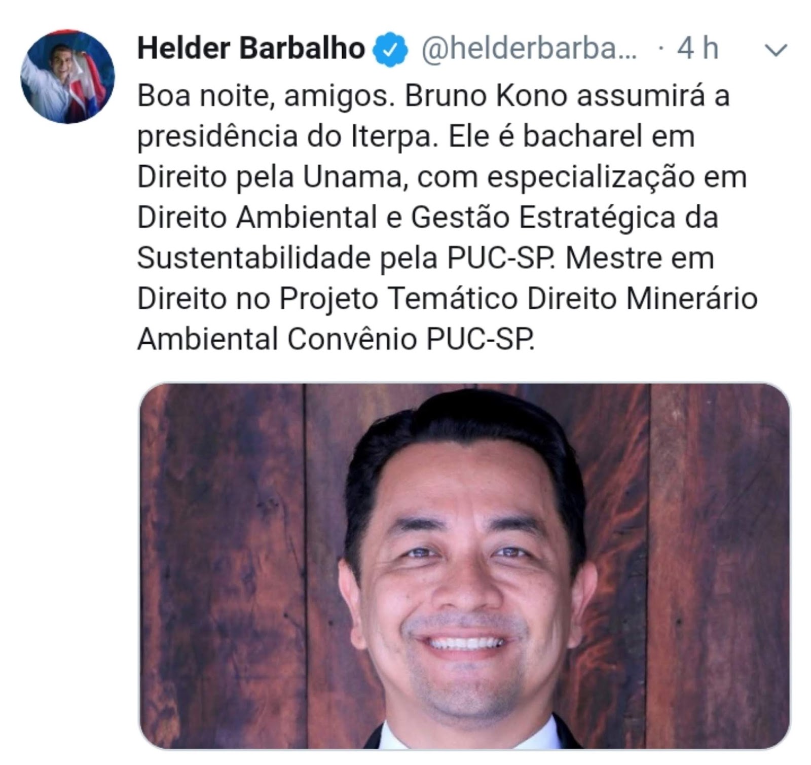 O governador eleito, Helder Barbalho, segue anunciando o primeiro escalão do seu governo, e através do seu perfil oficial no Twitter, ele anunciou o nome de Bruno Kono, que assumirá a presidência do Iterpa. Ele é bacharel em Direito pela Unama, com especialização em Direito Ambiental e Gestão Estratégica da Sustentabilidade pela PUC-SP. Mestre em Direito no Projeto Temático Direito Minerário Ambiental Convênio PUC-SP.É procurador autárquico concursado do Iterpa há 11 anos e vice-presidente da Comissão de Direito Agrário e do Agronegócio da OAB-PA. Atuando como membro da Comissão de Mediação de Conflitos Agrários do TJE-PA e Comissão de Estudos, Assessoramento e Combate à Grilagem do TJE-PA. O governador diz que irá trabalhar para transformar o Iterpa em um órgão ágil e protagonista do processo de regularização fundiária com transparência, responsabilidade, previsibilidade e que garanta segurança jurídica e planejamento a quem precisar.