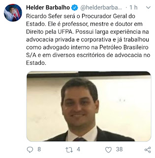 O governador eleito Helder Barbalho, também anunciou agora pela manhã em seu Twitter, Ricardo Sefer, que será o novo Procurador Geral do Estado. Ele é professor, mestre e doutor em Direito pela UFPA. Possui larga experiência na advocacia privada e corporativa e já trabalhou como advogado interno na Petróleo Brasileiro S/A e em diversos escritórios de advocacia no Estado.