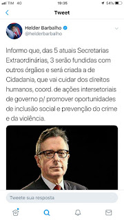 O governador eleito, Helder Barbalho, anunciou agora pouco em seu Twitter que, das cinco atuais Secretarias Extraordinárias, três serão fundidas com outros órgãos e será criada a de Cidadania, que vai cuidar dos direitos humanos, coordenado de ações intersetoriais de governo para promover oportunidades de inclusão social e prevenção do crime e da violência. A Secretaria de Cidadania será comandada por Ricardo Balestreri, historiador, com especialização em Psicopedagogia Clínica e em Terapia Familiar. Ele é o atual chefe do Gabinete de Assuntos Estratégicos de Goiás e membro da Comissão do Sinaped, do Governo Federal. Ele compõe o Observatório de Segurança com Cidadania na FGV e é professor da Universidade Estácio. Foi secretário de Segurança Pública e Administração Penitenciária de Goiás e secretário Nacional de Segurança Pública, período em que comandou a execução do PRONASCI.Ainda no âmbito do Ministério da Justiça, dirigiu o Departamento de Pesquisa, Análise da Informação e Desenvolvimento de Pessoal em Segurança. Presidiu o Pacto Integrador pela Segurança Pública, reunindo secretários e Inteligências de 22 estados da federação, inclusive o Pará.
