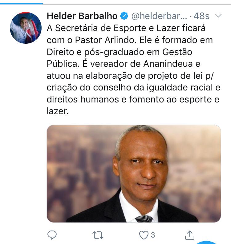 O governador eleito Helder Barbalho, anunciou agora há pouco em seu Twitter, o novo Secretário de Esporte e Lazer (SEEL) que será o Bispo Arlindo Silva. Ele é formado em Direito e pós-graduado em Gestão Pública. É vereador de Ananindeua e atuou na elaboração de projeto de lei para a criação do conselho da igualdade racial e direitos humanos e fomento ao esporte e lazer.