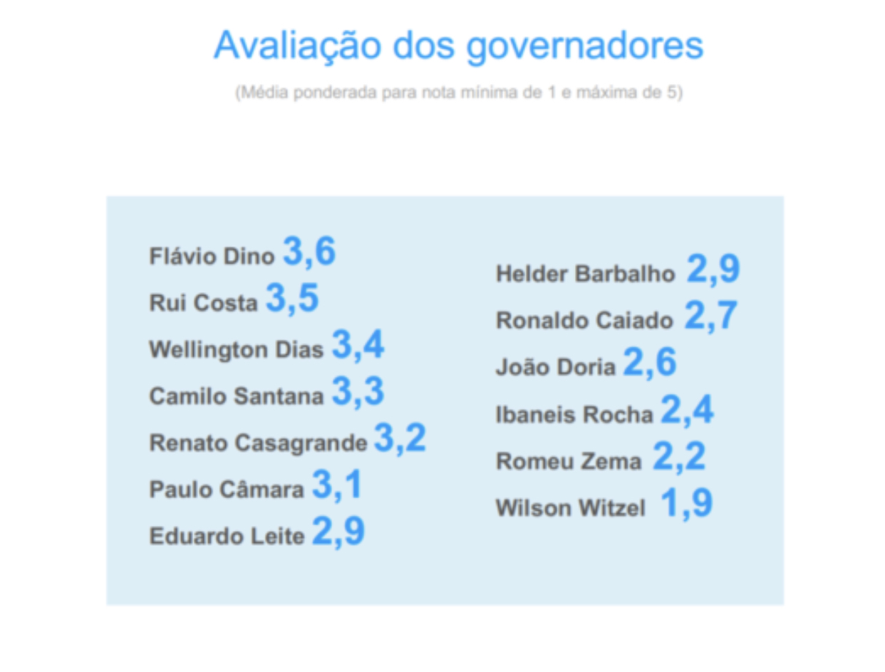 O objetivo da pesquisa trimestral é apontar as tendências predominantes no Congresso Nacional. Os parlamentares foram convidados a dar uma nota de 1 a 5 para o desempenho de 13 governadores pré-selecionados, considerando que 1 seria a pior avaliação e 5, a melhor. A média ponderada das respostas indicou 3,6 para Flávio Dino, e 3,5 para Rui Costa, o segundo mais bem avaliado. Wellington Dias ficou na terceira posição, com 3,4.