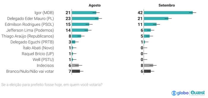 Delegado Eder Mauro (PL) tinha 23% dos votos estimulados e, agora, oscilou para 21%. Com a margem, tem entre 18 e 24%. Jefferson Lima (Podemos) tinha 14%. Agora, caiu para 6% nesta rodada. Com a margem de erro, tem entre 3 e 9%. Thiago Araújo (Republicanos) tinha 8% e, agora, aparece com 5%. Considerando a margem de erro, tem entre 2 e 8%. Considerando a margem de erro de 3 pontos percentuais, Edmilson Rodrigues, Jefferson Lima e Thiago Araújo estão tecnicamente empatados.
