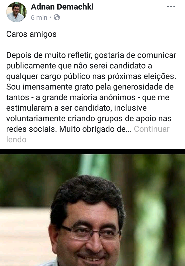 Em nota divulgado nesta noite de quinta-feira, 21, https://m.facebook.com/story.php?story_fbid=628000864226604&id=170243523335676 Adnan Demachki, diz não concorrer a nenhum cargo público nas eleições desse ano. É importante lembrar que, Adnan sempre foi excelente gestor se destacando pela sua habilidade tecnica. Além disso, foi um dos melhores prefeitos que Paragominas já teve. Mas mesmo experiente sucumbiu do cargo de Secretário de Desenvolvimento Econômico do Estado, justamente por se desencantar dessas promessas não cumpridas. Pelo visto, mais um do grupo de enganados por Jatene.