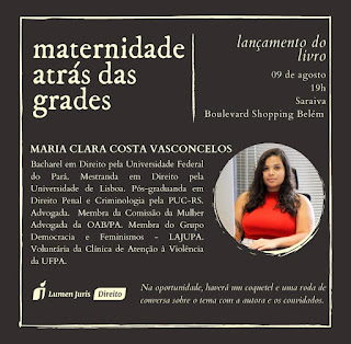 No próximo dia 09 de Agosto, às 19h no Auditório da Livraria Saraiva no Shopping Boulevard. A Advogada Maria Clara Vasconcelos, lançará o livro “Maternidade atrás das grades” onde na oportunidade fará uma palestra sobre marternidade, sistema carcerário e direito das mulheres. Um coquetel será servido aos convidados e parte do lucro das vendas será destinado às mulheres da Unidade Materno Infantil de Ananindeua.