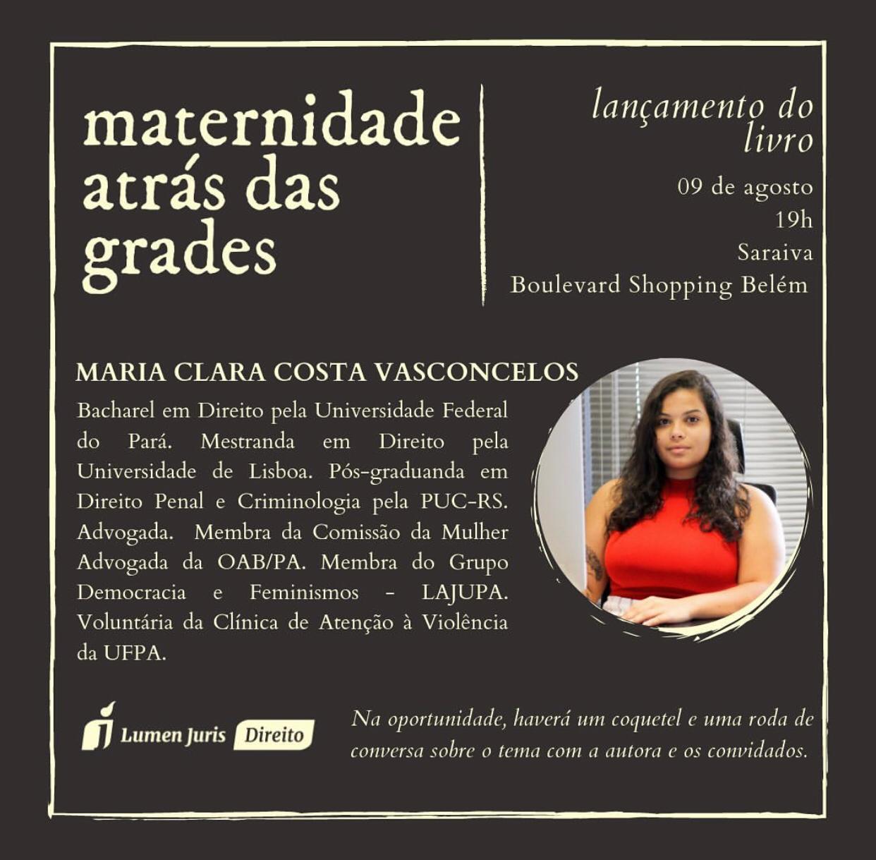 No próximo dia 09 de Agosto, às 19h no Auditório da Livraria Saraiva no Shopping Boulevard. A Advogada Maria Clara Vasconcelos, lançará o livro “Maternidade atrás das grades” onde na oportunidade fará uma palestra sobre marternidade, sistema carcerário e direito das mulheres. Um coquetel será servido aos convidados e parte do lucro das vendas será destinado às mulheres da Unidade Materno Infantil de Ananindeua.