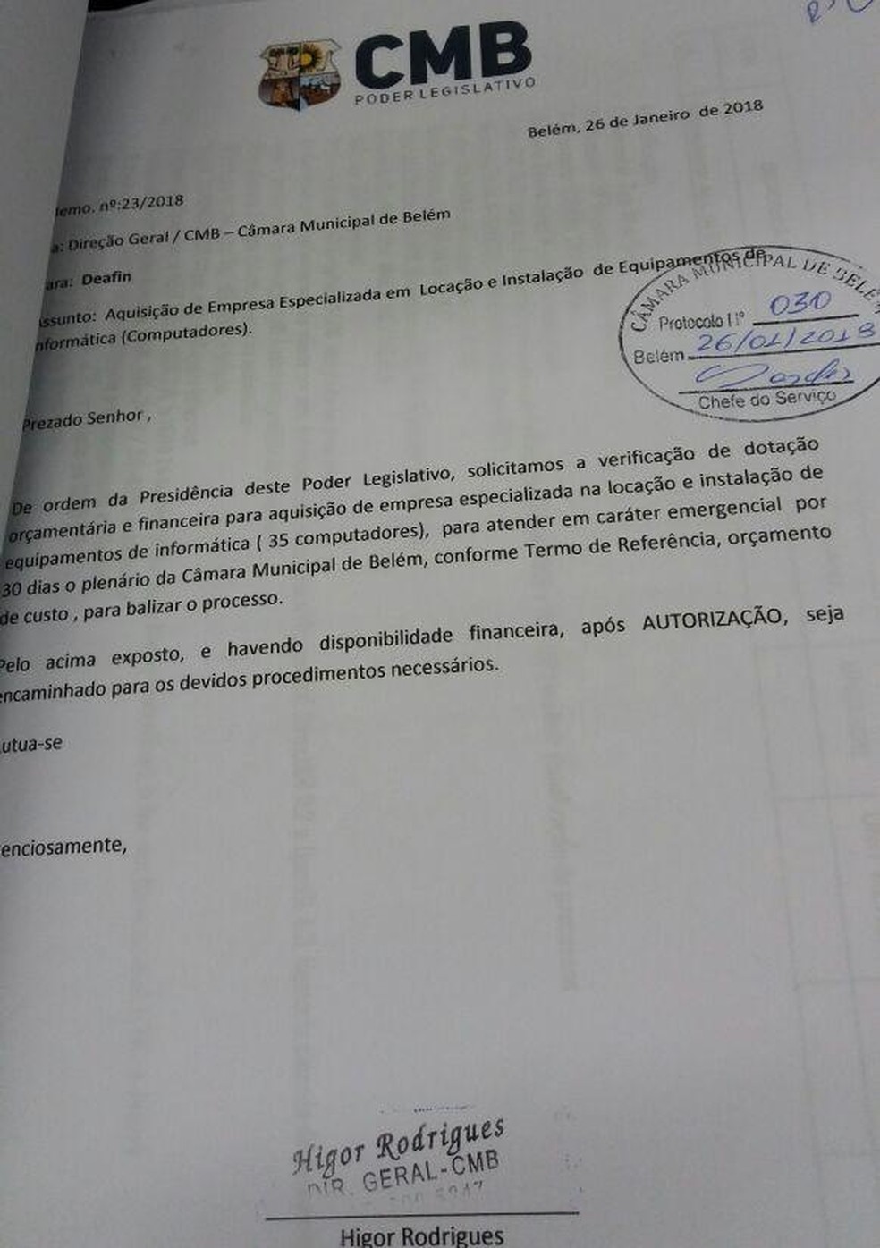 A Câmara justificou a instalação dos trinta e cinco computadores antes da realização do pregão, sob o argumento da necessidade de dispensa de licitação para locação e instalação de equipamentos de informática para atender, “em caráter emergencial, por trinta dias o plenário da Câmara Municipal de Belém”, num memorando com pedido assinado pelo Diretor Geral, Higor Rodrigues.