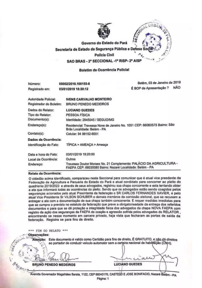 A chapa Nova Faepa liderada por Luciano Guedes e os advogados representantes dele tentaram a todo custo na sede da Federação da Agricultura e Pecuária do Pará – FAEPA, ter acesso a documentação da chapa adversária, mas o atual presidente e candidato à reeleição, Carlos Xavier não autorizou o acesso. Uma comissão da OAB foi acionada, mas foi barrada e não lhe foi permitido acesso aos documentos.