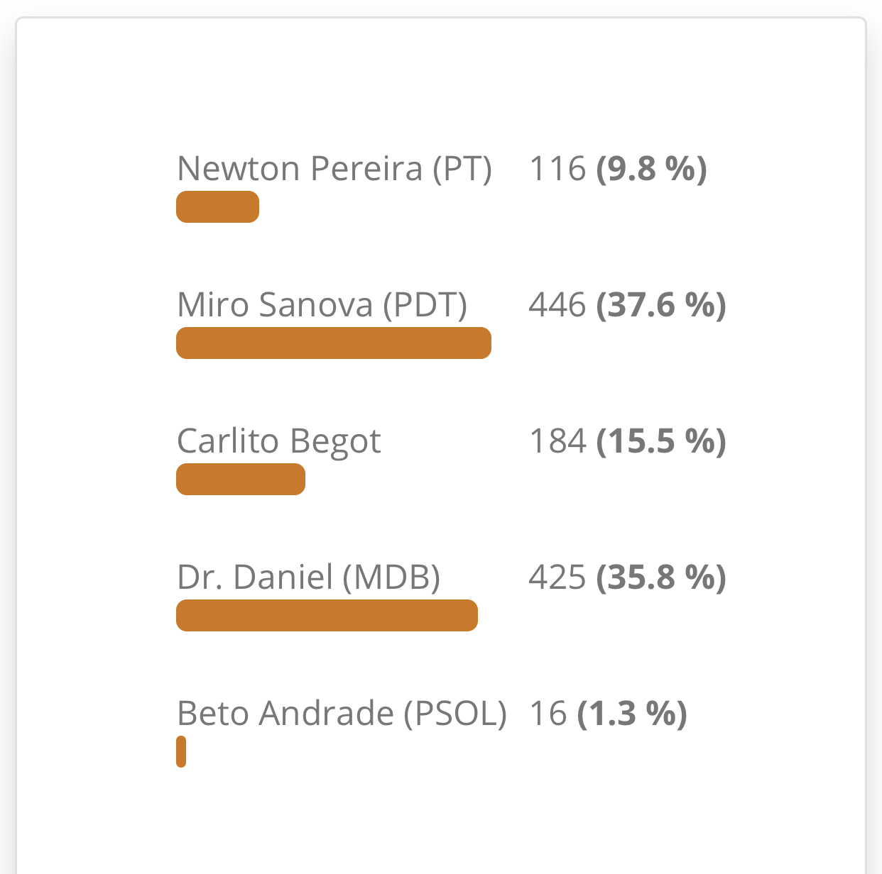 O deputado estadual Miro Sanova (PDT) obteve 446 votos (37.6%) e ficou em primeiro lugar de preferência, o Presidente da ALEPA, deputado estadual Dr. Daniel (MDB), obteve 425 votos (35.8%) e ficou em segundo lugar, o atual vice-prefeito Carlito Begot, obteve 184 votos (15.5%) e ficou em terceiro lugar. Newton Pereira (PT) obteve 116 votos (9.8%), Beto Andrade (PSOL) obteve 16 votos (1.3).