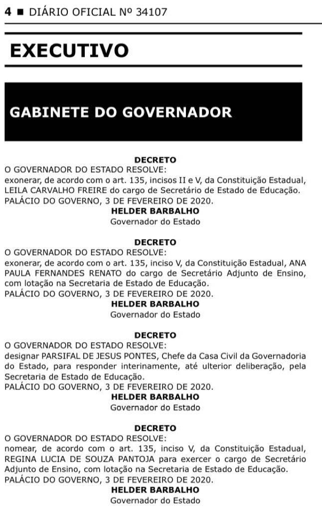 Foi publicada na manhã desta terça-feira (4), no Diário Oficial do Estado do Pará, a exoneração da secretária de educação do estado do Pará, Leila Freire. O decreto foi assinado na segunda-feira (3) pelo governador Helder Barbalho.