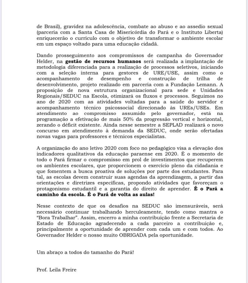 Em carta endereçada aos colegas da SEDUC Leila Freire faz balanço da sua gestão e se despede da pasta, agradecendo a oportunidade dada pelo governador.