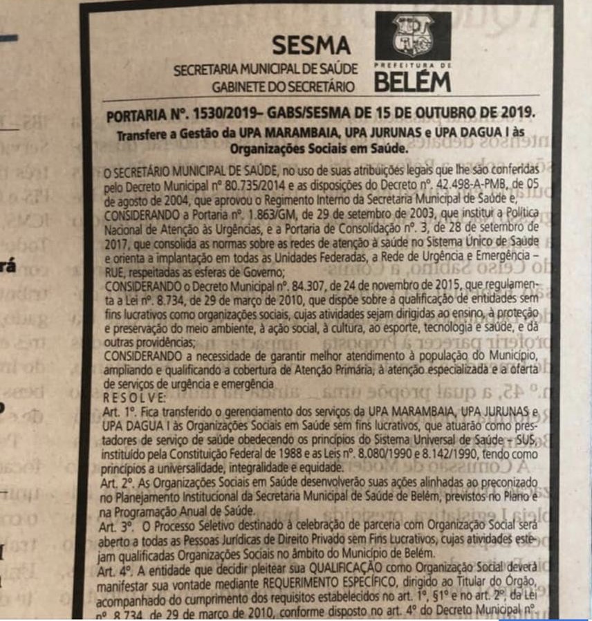 O Prefeito de Belém, Zenaldo Coutinho, mais uma vez com suas atitudes de quem não consegue administrar uma cidade. Além de não construir um novo Pronto Socorro, de não reformar o Ver-O-Peso, não resolver a questão do lixo e não entregar o tão famoso BRT e nem resolver o caos do transporte público, agora ele quer privatizar UPA’s. Isso mesmo, a prefeitura de Belém planeja transferir a gestão das Unidades de Pronto Atendimento da Marambaia, Jurunas e Dágua I às Organizações Sociais em Saúde, ou seja, repassa para a iniciativa privada a gerência de um serviço que é público e gratuito. É mais um absurdo da desastrosa gestão de Zenaldo.